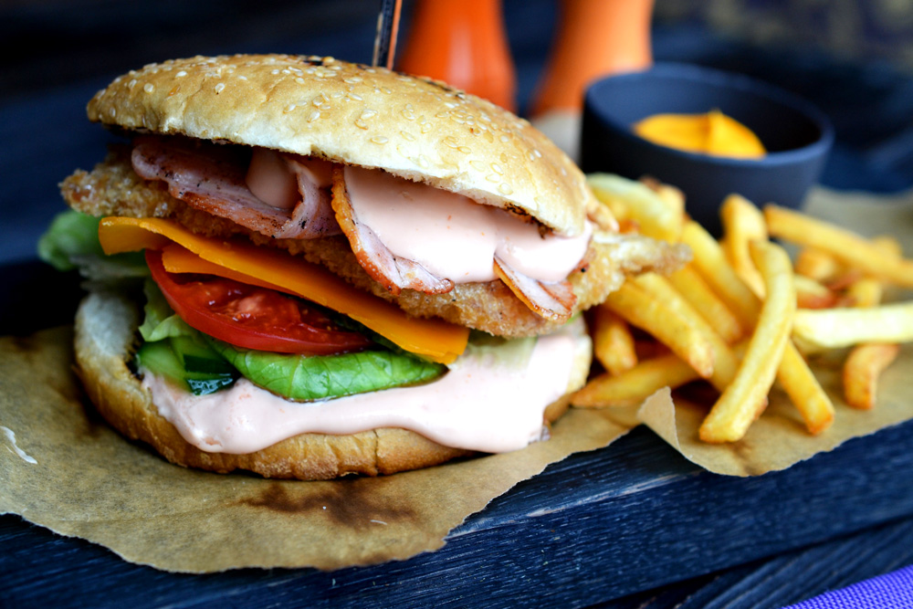 Бургер с куриной грудкой, беконом, томатами