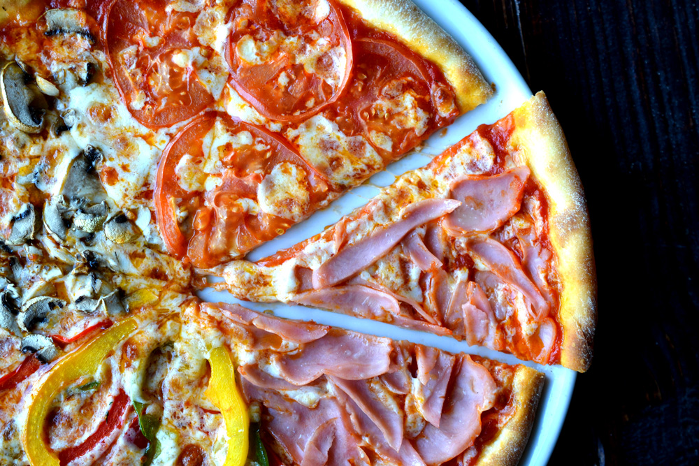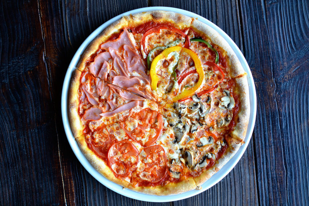 ветчина, томаты, болгарский перец, шампиньоны, соус для пиццы, сыр моцарелла