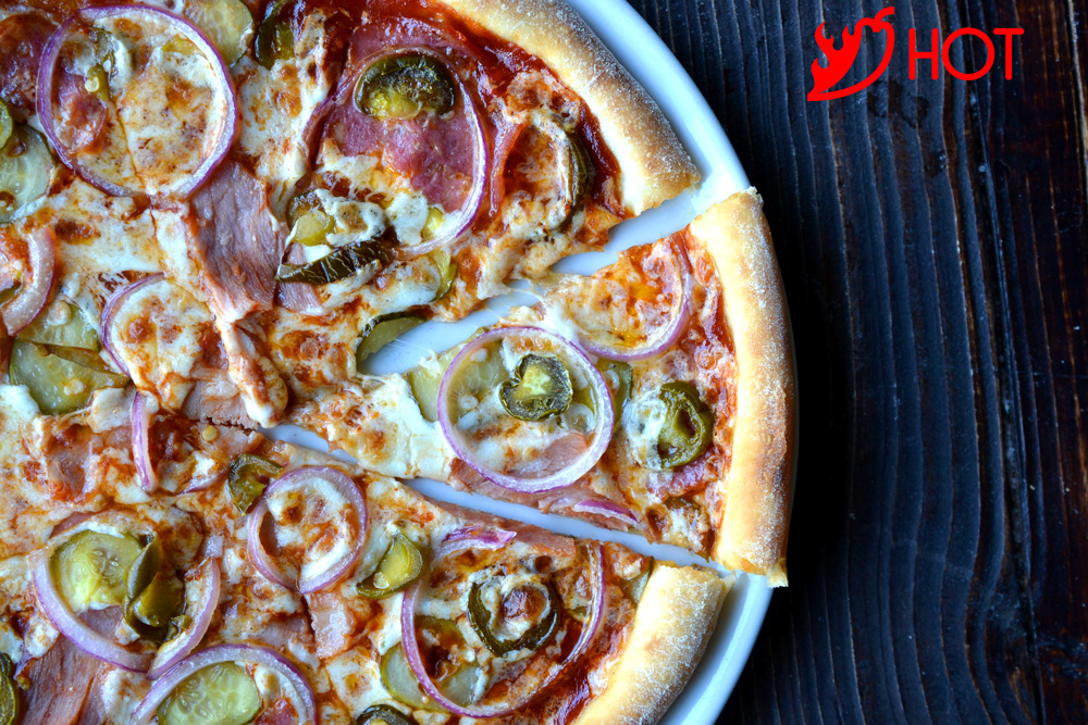 ветчина, колбаса салями, огурцы маринованные, лук красный, перец Халапенью, помидоры, сыр моцарелла, соус барбекю