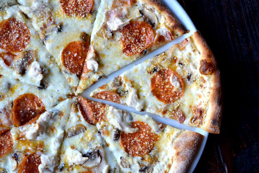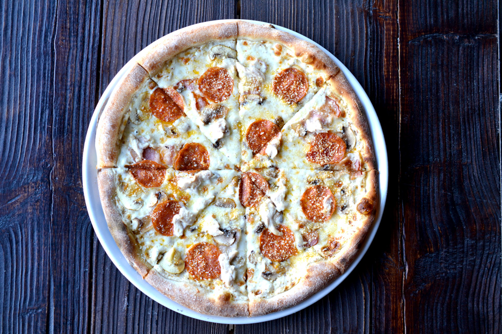 пепперони, бекон,куриная грудка, шампиньоны, соус цезарь, сыр моцарелла