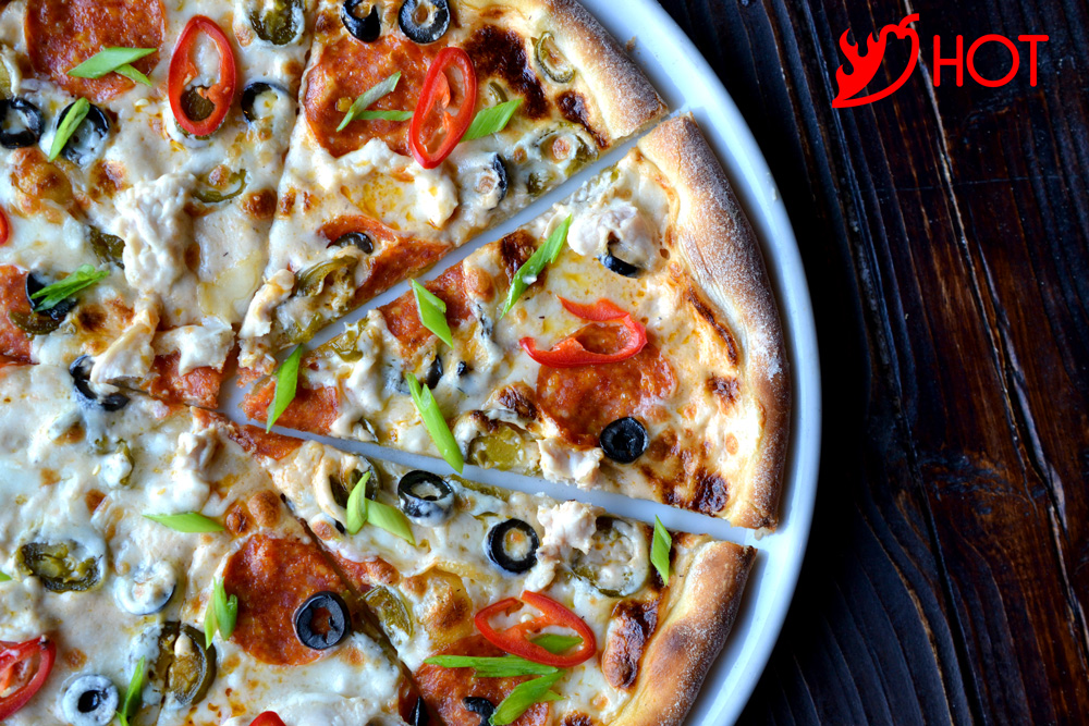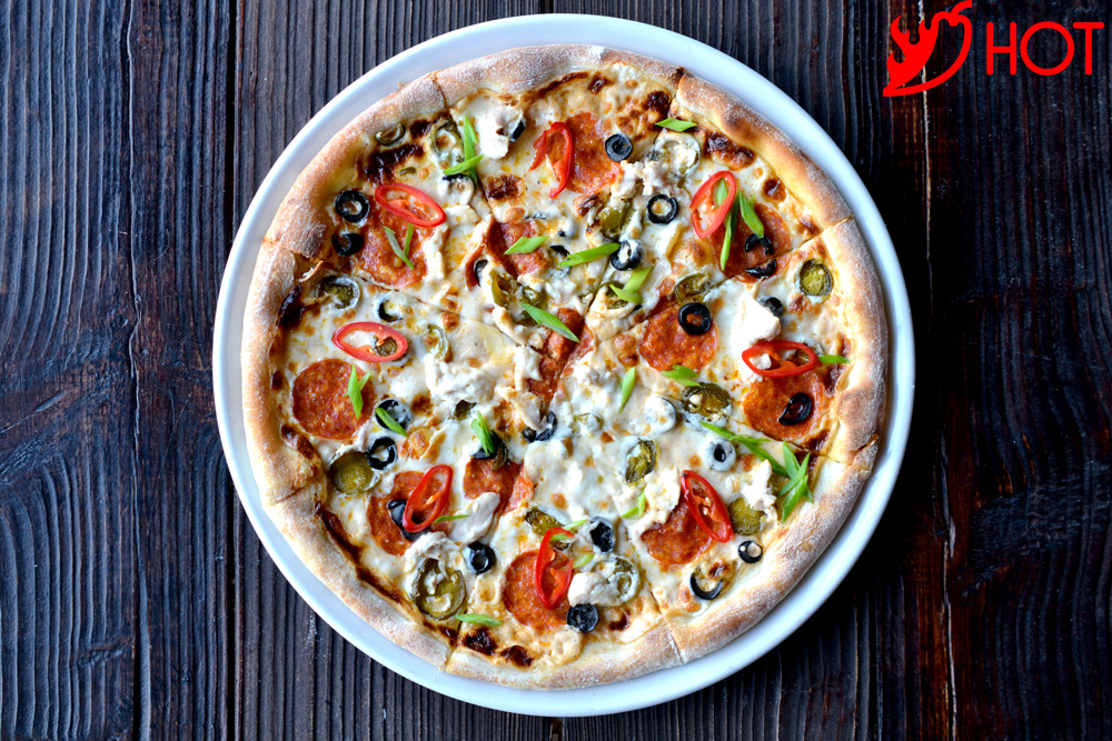пепперони, куриная грудка, халапеньо, маслины, зеленый лук,перец чили, спайс соус, сыр моцарелла