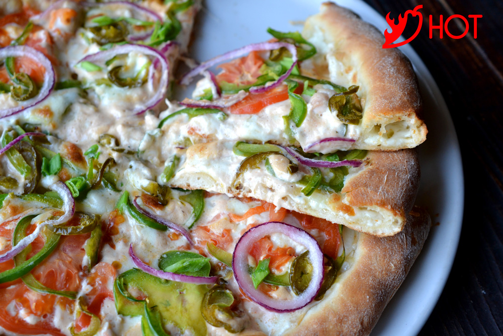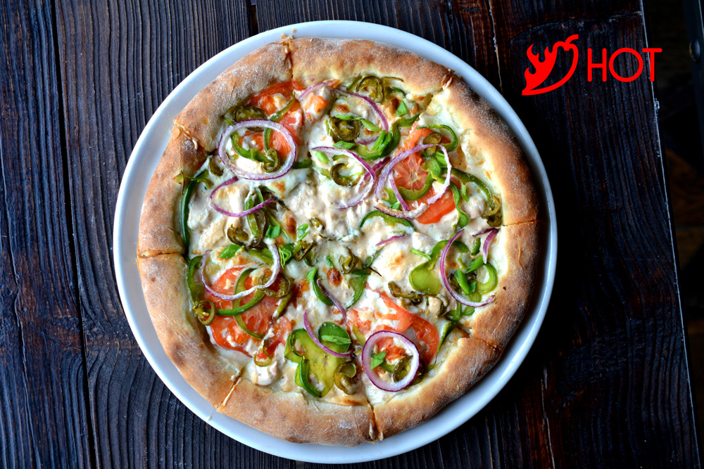 сыр моцарелла, соус спайс, халапеньо, помидоры,лук красный, лук зеленый, перец зеленый болг, куриное филе