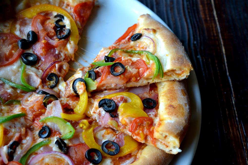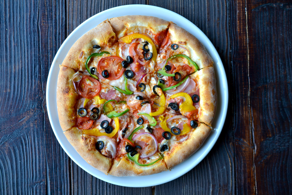 сыр моцарелла, соус для пиццы, помидоры, перец зеленый болг, перец желтый болг, маслины, ветчина, салями, бекон, лук красный