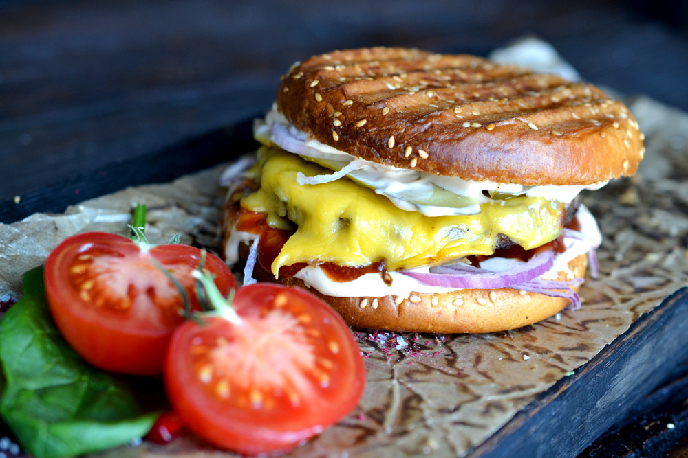 булочка, говядина, огурцы марин., красный лук, сыр чеддер, соус фирменный, соус барбекю