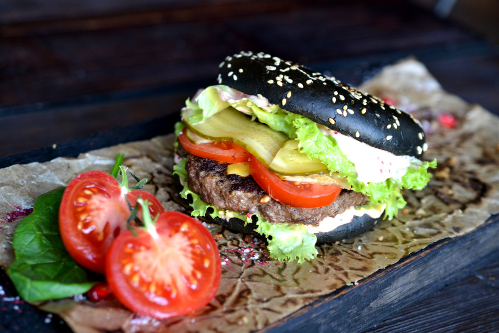 Черная булочка, говядина, салат листовой, огурцы марин,помидоры, сыр чеддер, Соус фирменный