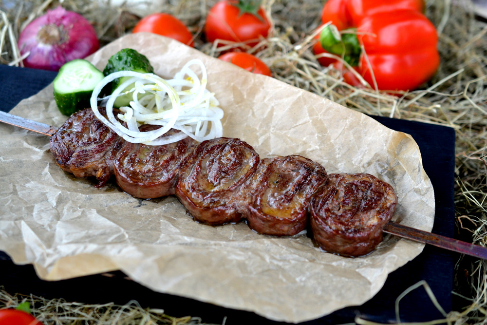 Говяжья вырезка, скрученная в рулетики с бараньим жиром