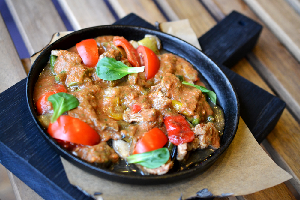 теплый салат с телятиной, баклажанами фри, сладким перцем, стручковой фасолью, запеченными томатами, под томатно-перечной заправкой.